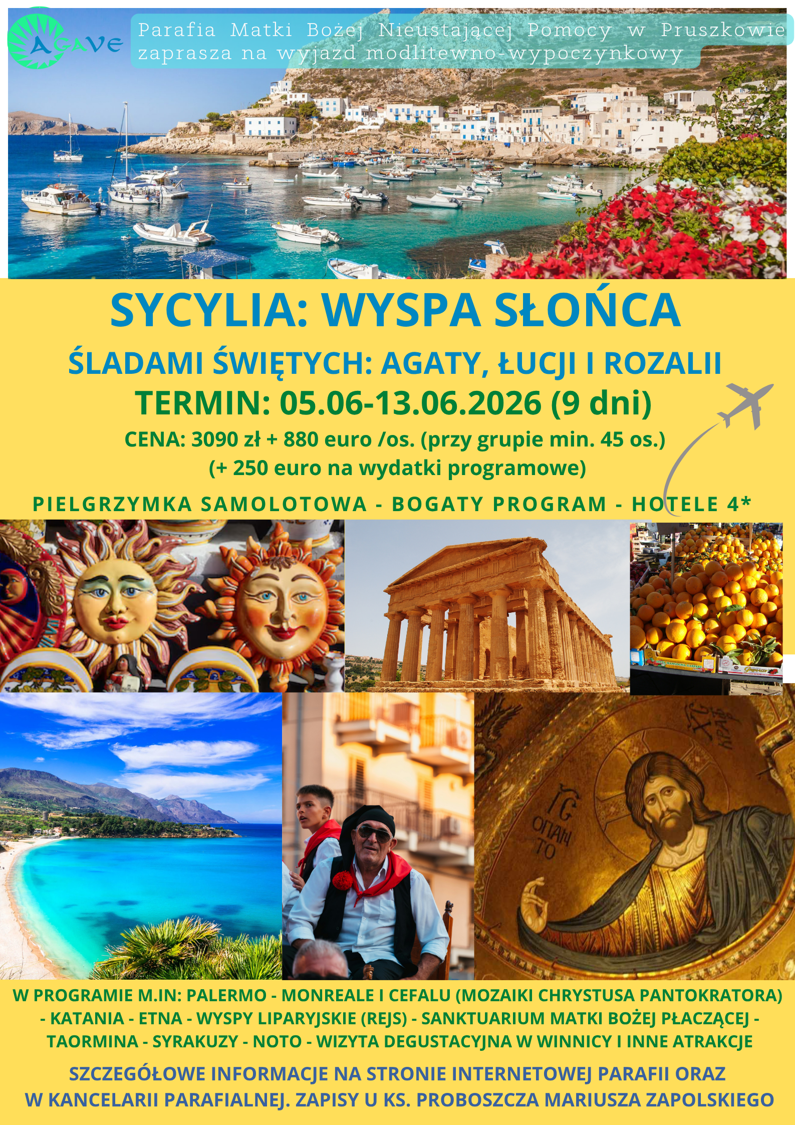 8. Nasza parafia organizuje w przyszłym roku w dniach od 5 do 13 czerwca PIELGRZYMKĘ SAMOLOTOWĄ na SYCYLIĘ – WYSPĘ SŁOŃCA śladami świętych: ROZALII, AGATY i ŁUCJI. W programie m.in.: PALERMO, MONREALE, CEFALU, KATANIA, ETNA, WYSPY LIPARYJSKIE, SYRAKUZY, NOTO. Szczegóły na plakacie w gablocie, na ulotkach za ławkami i na naszej stronie internetowej. ZAPISY w kancelarii i zakrystii DO 12 LISTOPADA !!! Serdecznie zapraszamy!